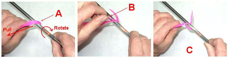A = Keep a moderate amount of tension on the base pulling away from the shaft with one hand, while rotating the shaft with your other hand. For the first half of the turn, keep your finger pressing the end of the feather to the shaft as you pull the feather around.