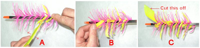 B = If you only want to use one feather per arrow -- YOU'RE DONE! A single feather wrap like this will allow the arrow to fly somewhat further than a 2 feather spiral. But the arrow will fly just fine this way. It is hard to imagine a simpler or lower cost way to make a flu-flu arrow than this!