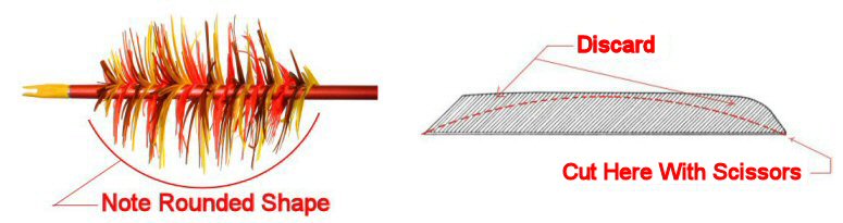 It's really easy to make "custom shapes" in this type of flu-flu. The rounded shape is made by simply cutting an "arc" in the web of each feather before spiral wrapping in the usual way. It isn't necessary to be very accurate in cutting the "arc"... the segments will be spread out in a random fashion, anyway.(Special thanks to Bob Jacobsen of Jake's Archery, (765 S. Orem Blvd., Orem, UT 84508, 801-225-9202) for this and the following suggestion!)
