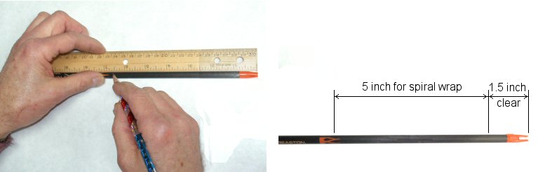We like to leave about a 1.5 inch space from the tip of the nock to the end of the spiral wrapped feathers and do the wrapping along about a 5 inch length of shaft. You can vary these spacings depending on the appearance desired.