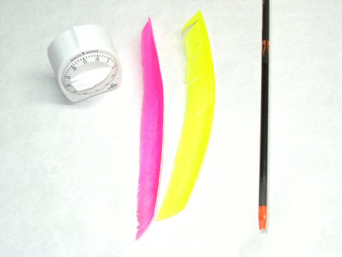 A = TRUEFLIGHT SPECIALLY PREPARED FULL LENGTH FOR SPIRAL WRAP FLU-FLUS. Regular full length will not wrap around the shaft easily. We'll use 2 feathers in contrasting colors for this example.
