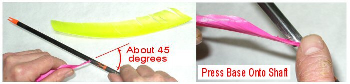 After the coated surfaces have touched, press down on the end of the feather base to insure a permanent bond. (The web of the feather can be pressed down on top of the base temporarily to apply force to the base against the shaft.)