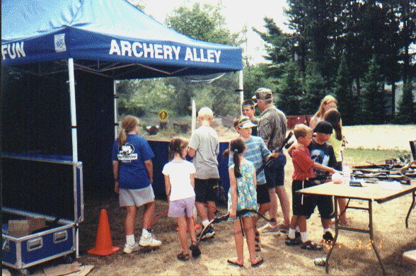 The Archery Alley again was a huge success throughout our country. This year we added a little spice to ours by using cardboard silhouettes of deer, bear and turkeys, suspended by the cables which hold the target plates. We also suspended some 2" by 24" long P.V.C. pipe horizontally with a tiny balloon pushed to the front of the pipe and a soup can at the other end. Talk about having fun, the kids had a ball with it. If the kids put their arrow in the tube we called it a "Robin Hood" and they got a free ice cream or pop. We had about 10 kids that were able to accomplish this challenge. Next year I would like to take our Archery Alley to the Department of Natural resources section of the Wisconsin State Fair. Can you just imagine how many new kids we can reach there? Hopefully, next year I'll have a successful story to share with you about that. ![]()