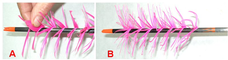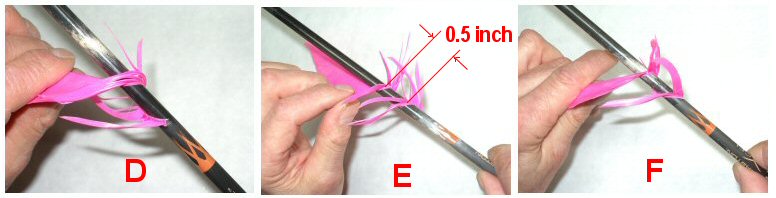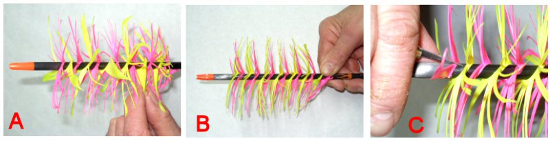 B = If you only want to use one feather per arrow -- YOU'RE DONE! A single feather wrap like this will allow the arrow to fly somewhat further than a 2 feather spiral. But the arrow will fly just fine this way. It is hard to imagine a simpler or lower cost way to make a flu-flu arrow than this!