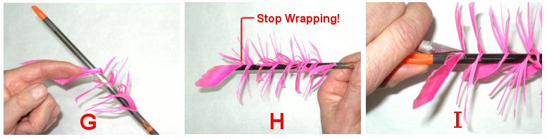 G = A little "nudge" is usually all it takes to encourage the web to split and pop up.H = When you are near the end of the glued part of the shaft, STOP! (If the feather is too short to make it all the way to the end of the glue, don't worry -- just press the end onto the shaft where it stops. A little shorter or longer spiral will make no noticeable difference in the flight of the arrow.)