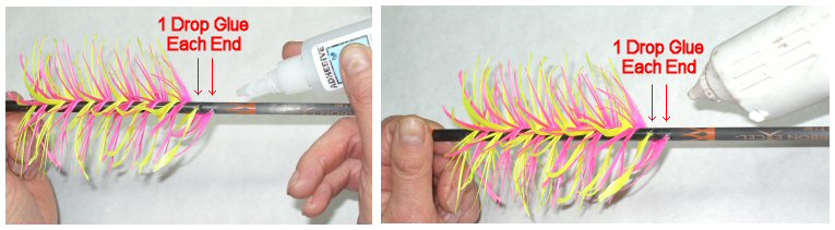 For extra security and unusually severe use, we simply add a drop of glue at each end of the feathers."Jell Type" super glue (or "Gap Filling" super glue) seems to work best. "Hot Melt" glue will also work, although you need to be careful not to use too much and leave a "bump".