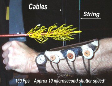 We were amazed to find that Flu-Flu arrows of either type can be repeatedly shot from compound bows, including high performance 300 fps compound bows, without damage.I would have bet anything that one shot across the cables of a compound bow would shear the web right off either type of Flu-Flu arrow. Not so! Unbelievably, the high web of the Flu-Flu goes right past the cables without any problem. High speed photos show that this is due at least in part to the "lean back" of the web segments at speed helping clear the cables, while the natural resilience does the rest.