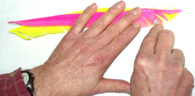 A = TRUEFLIGHT SPECIALLY PREPARED FULL LENGTH FOR SPIRAL WRAP FLU-FLUS. Regular full length will not wrap around the shaft easily. We'll use 2 feathers in contrasting colors for this example.