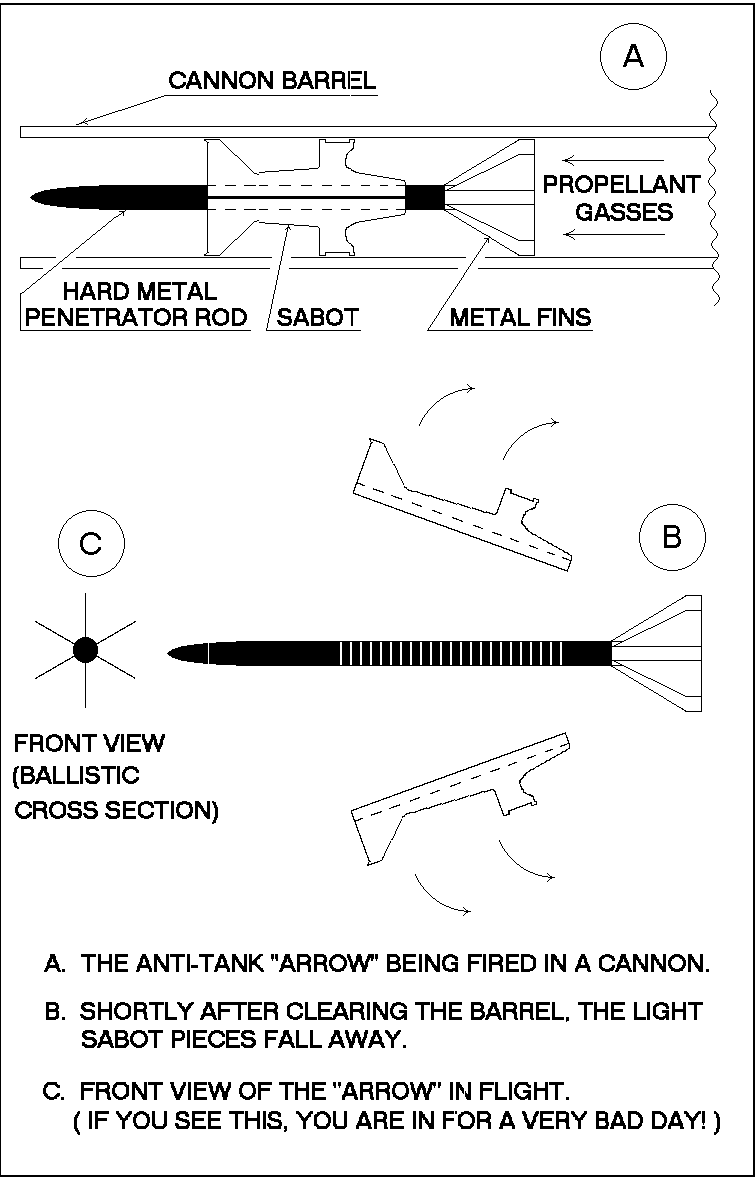 And one heck of an arrow it is. This anti-tank "projectile" is basically a hard, dense metal rod about 1 inch in diameter, and about 18 inches long. It is stabilized in flight by metal fins at it's rear. This metal rod contains no explosive! It penetrates any known armor simply by it's own momentum - it's rumored speed is on the order of 6000 FPS!